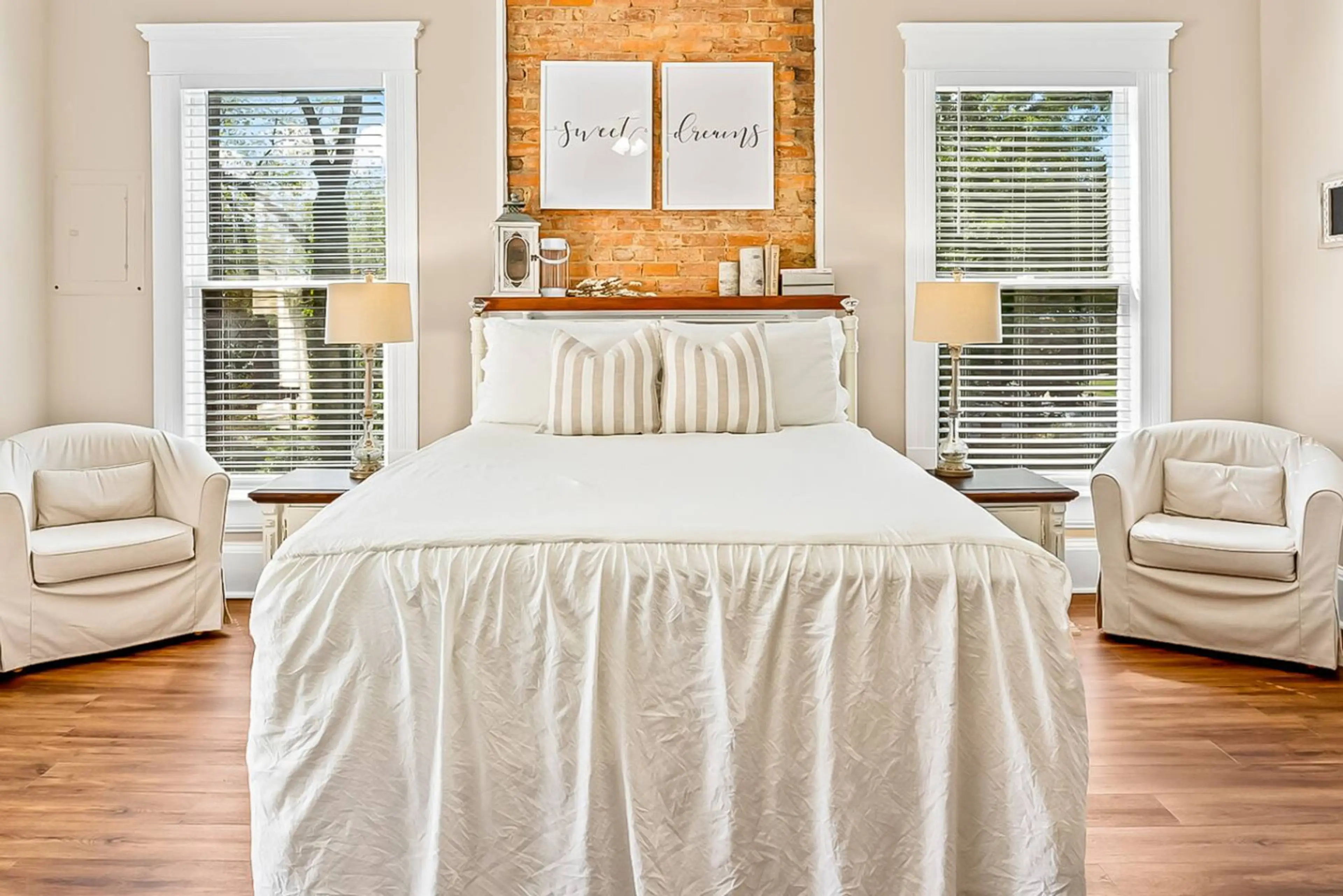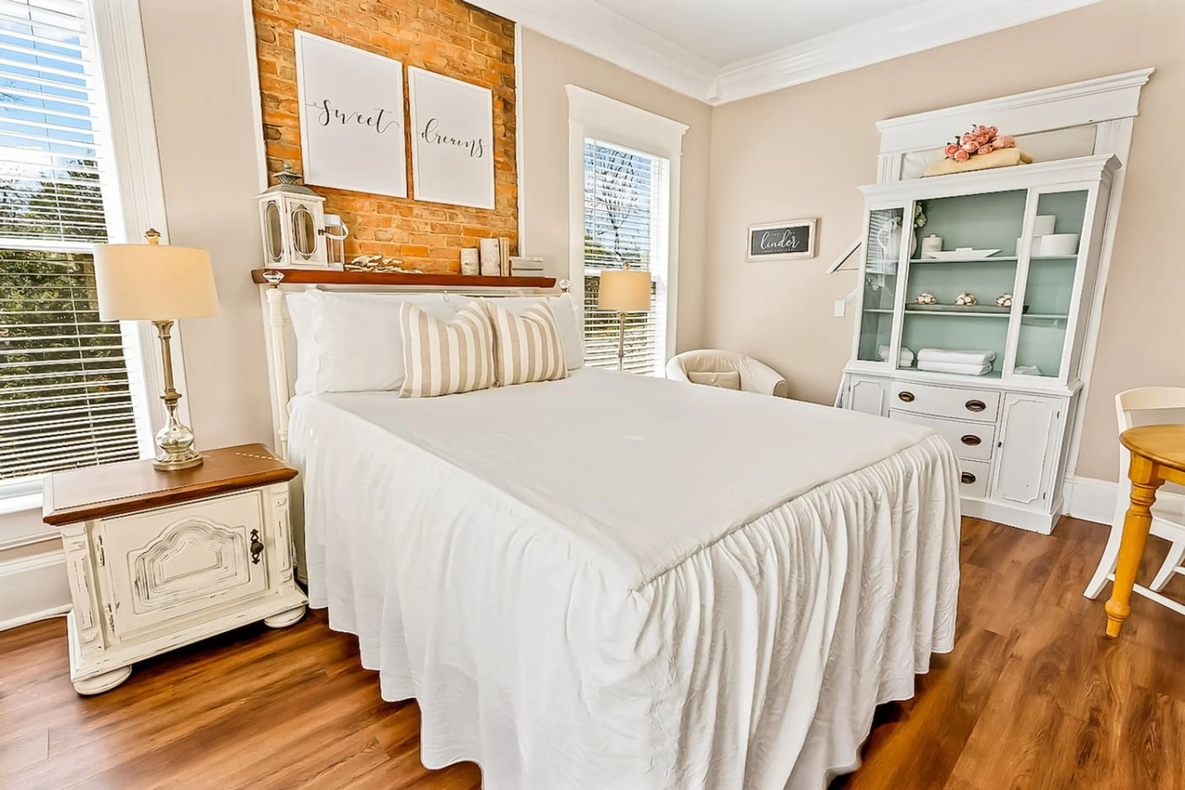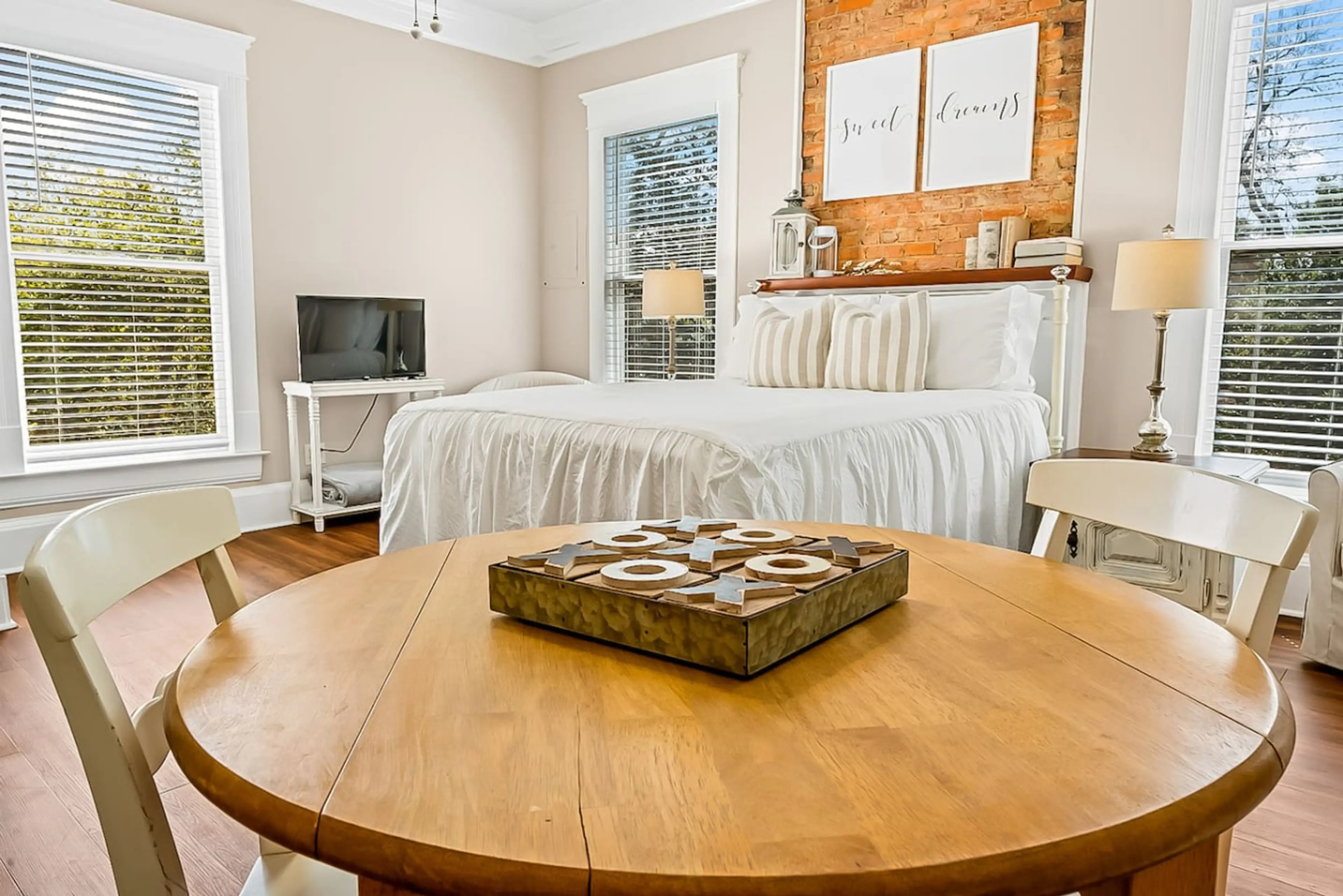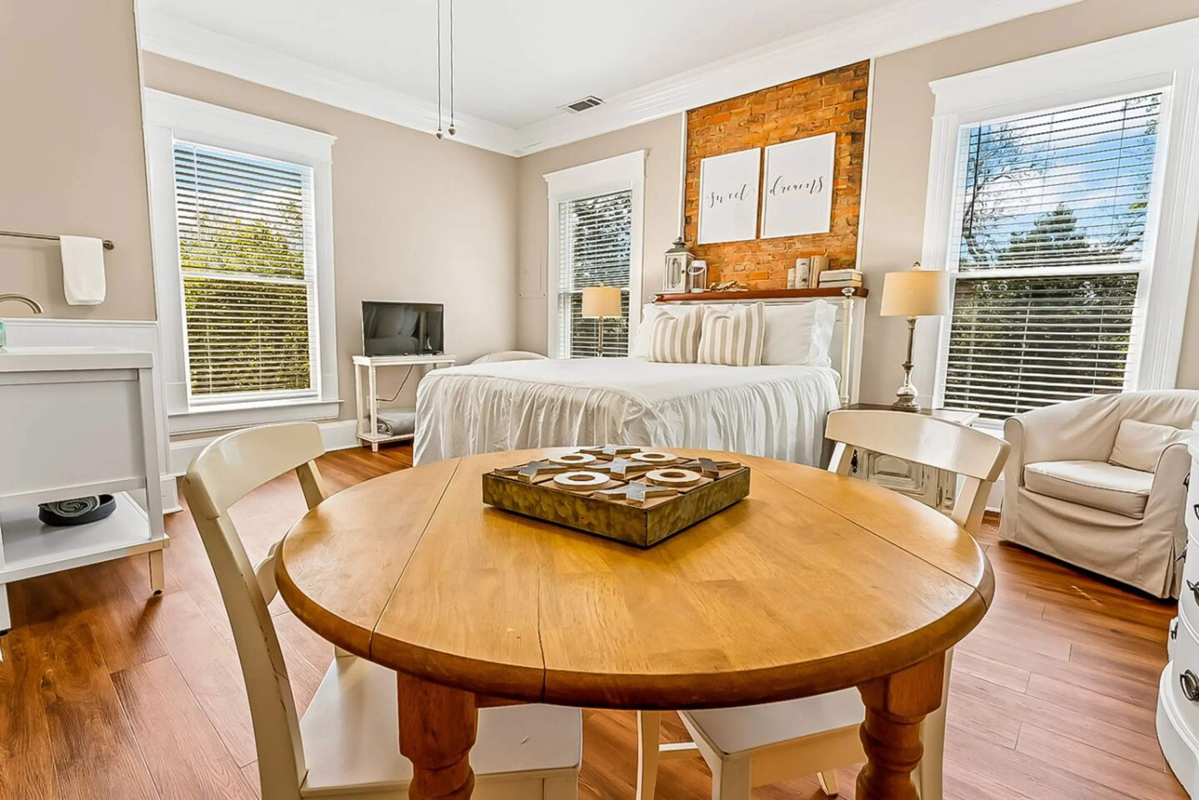 Escape to our modern farmhouse private room in Winder, GA! This tranquil retreat for 2 features an exposed brick wall, a cozy kitchenette, and a plush queen bed. Enjoy access to multiple outside seating areas, all just a short walk from downtown shops and restaurants. Perfect for a relaxing getaway ...