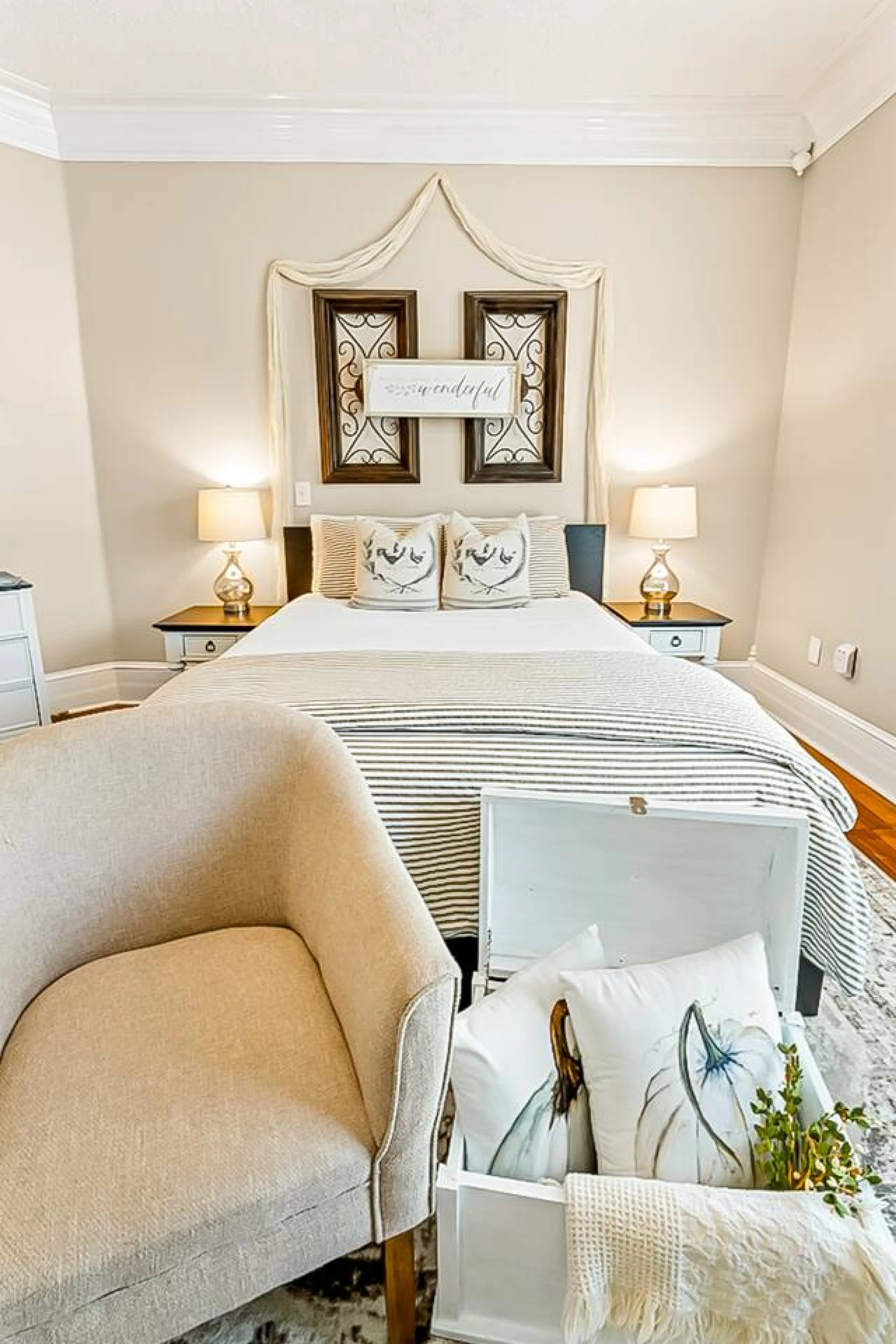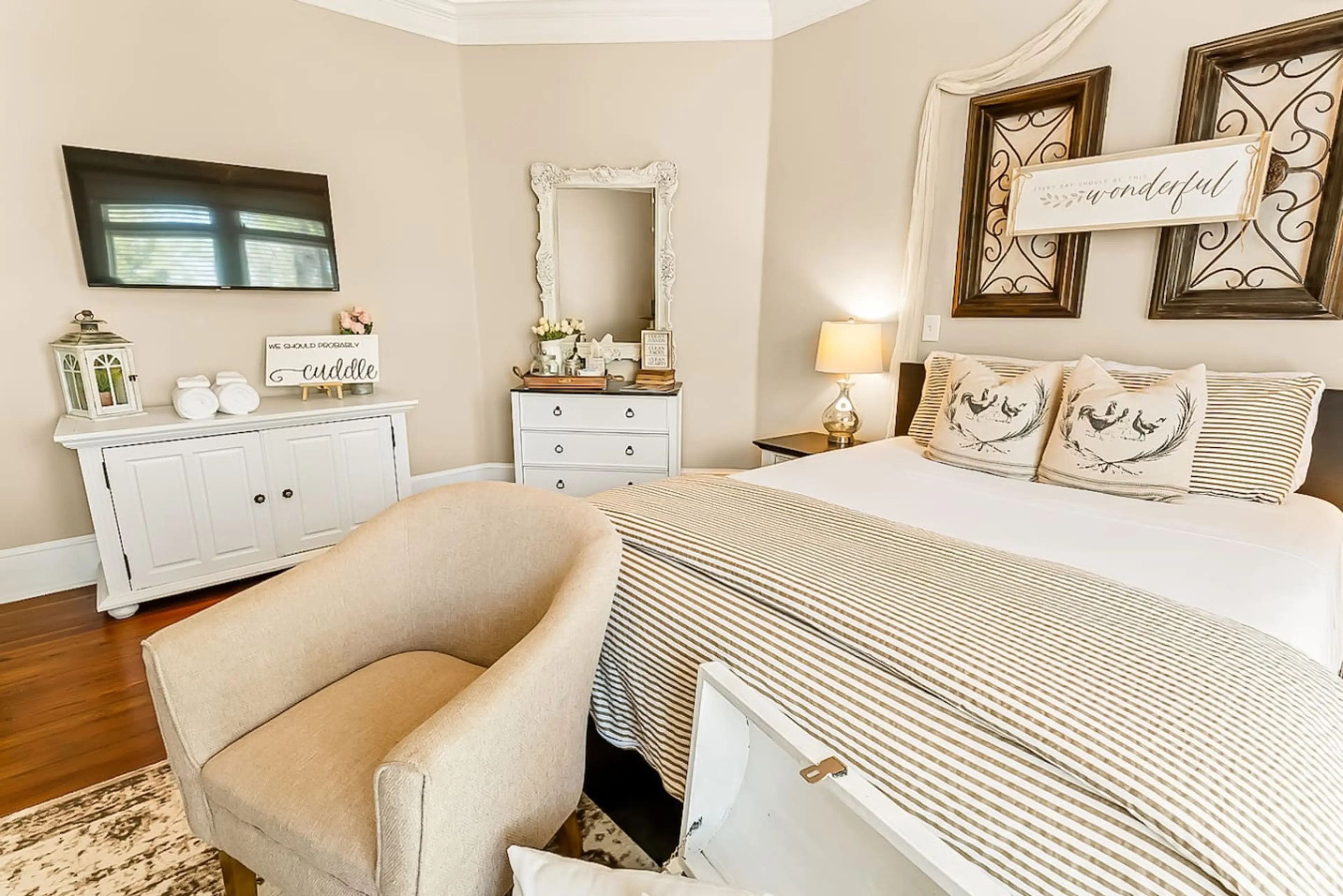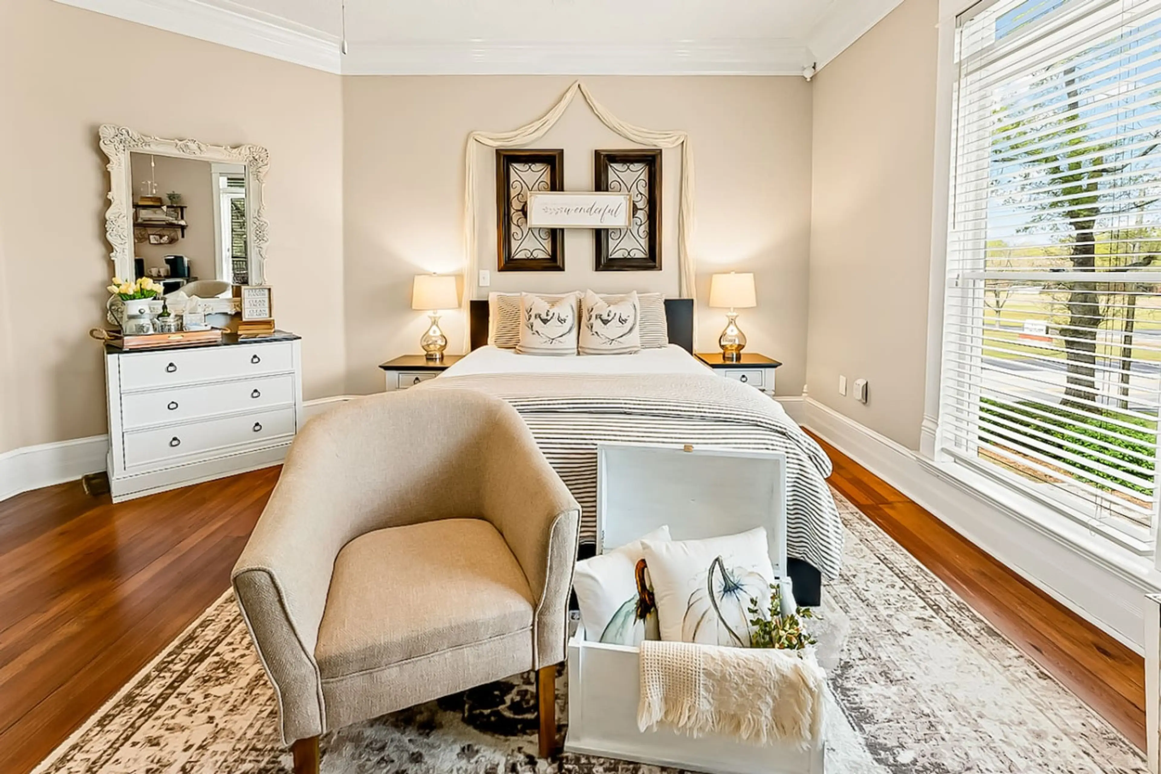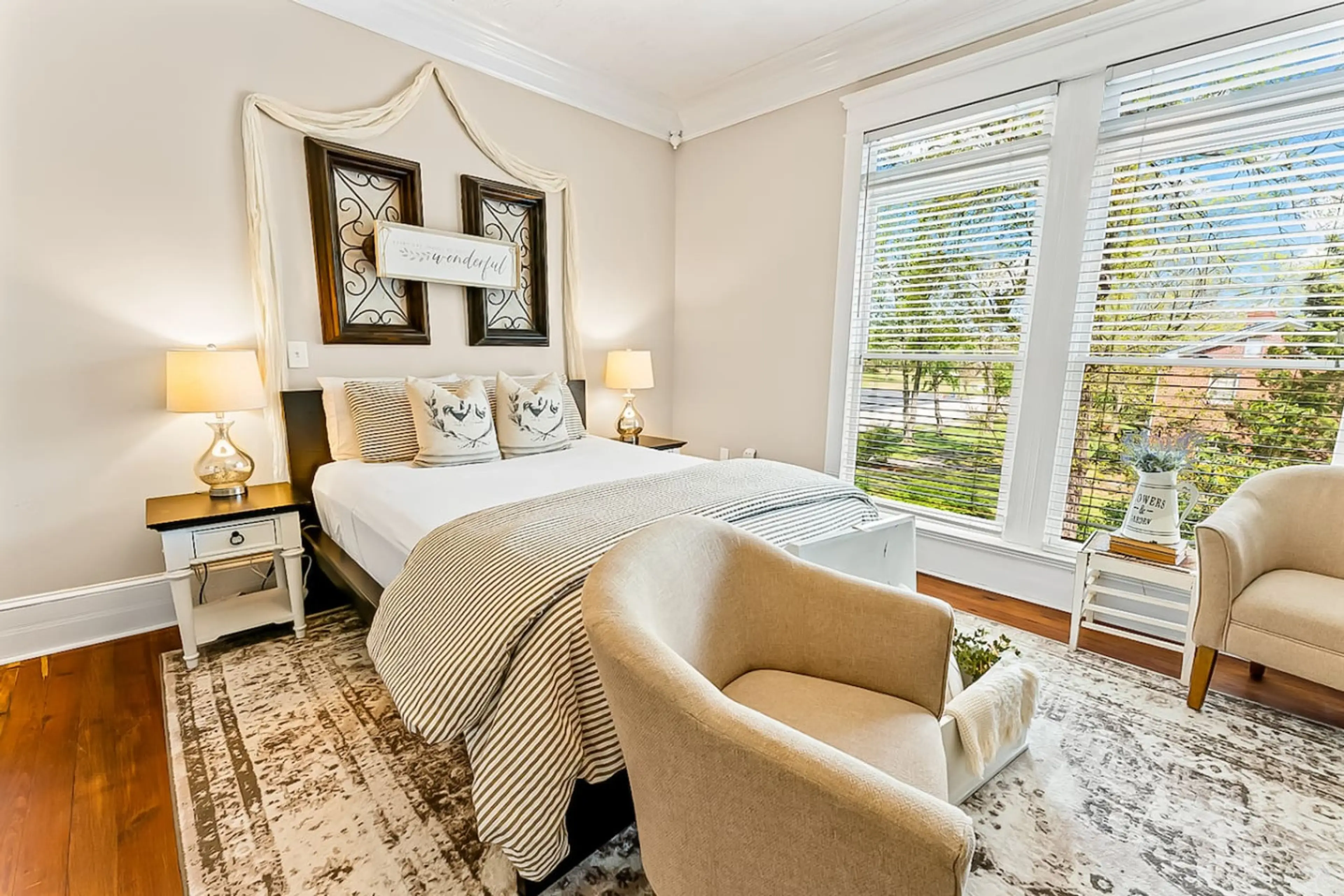 Escape to our modern farmhouse-style upstairs bedroom! Enjoy a private coffee bar, ample natural light, and a comfy bed. Guests have access to a shared bathroom. Perfectly located within walking distance to downtown shops and restaurants, and a short drive to Fort Yargo State Park. Ideal for solo tr...